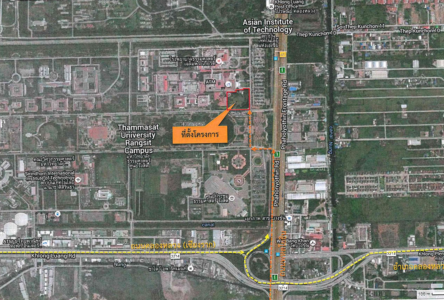 |  แผนที่ตั้งโครงการ โครงการศูนย์การแพทย์ธรรมศาสตร์ ตั้งอยู่ในพื้นที่โรงพยาบาลธรรมศาสตร์เฉลิมพระเกียรติ ตำบลคลองหนึ่ง อำเภอคลองหลวง จังหวัดปทุมธานี บนเนื้อที่ประมาณ 9.5 ไร่ เป็นอาคารสูง 10 ชั้นและที่จอดรถใต้ดิน 1 ชั้น ที่จอดรถรวม 177 คันมีพื้นที่ใช้สอยรวม 53,965 ตร.ม. พร้อมงานปรับภูมิทัศน์พื้นที่ประมาณ 6,600 ตร.ม. เป็นอาคารที่มุ่งเน้นการให้บริการรักษาพยาบาลเป็นหลัก มีห้องตรวจรักษาผู้ป่วยนอก,คลีนิคเฉพาะทางห้องพักผู้ป่วยใน 150 ห้อง และส่วนบริการอื่นๆ  |