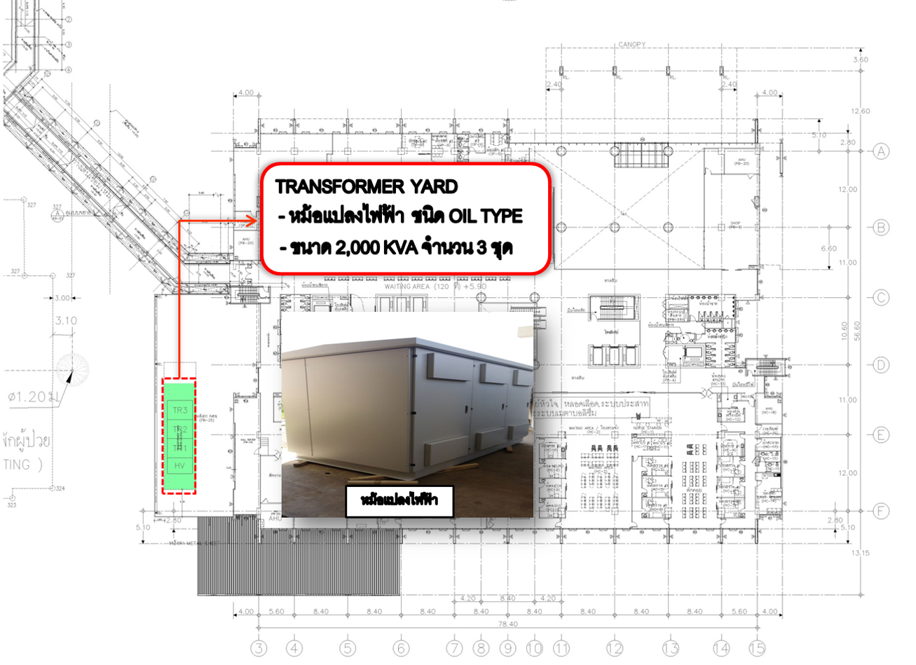 - หม้อแปลงไฟฟ้า (TRANSFORMER) ชนิด OIL TYPE ขนาด 2,000 KVA จำนวน 3 ชุด ชนิดตั้งบนพื้นล้อมรั้ว อยู่บริเวณดาดฟ้า ชั้น 2 ของอาคาร