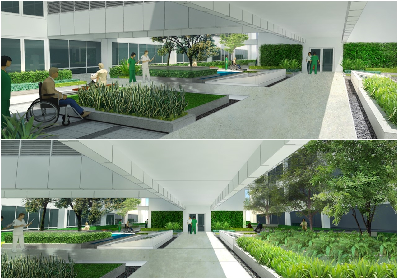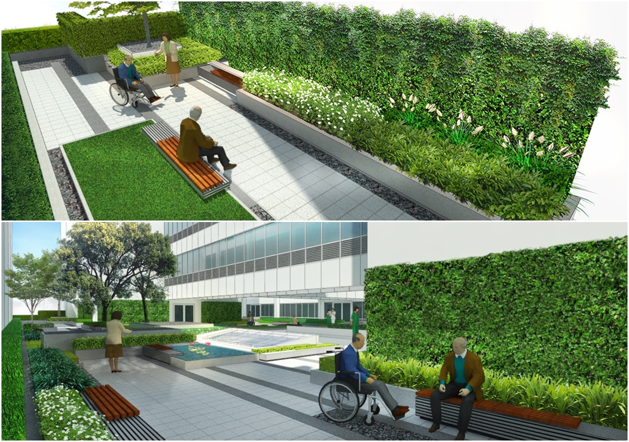 สวนหย่อม(Roof Garden) ชั้น 6 ที่พักตาพักใจของผู้ป่วย  ด้วยแนวคิดในการรักษาพยาบาลในปัจจุบัน จะให้ความสำคัญกับทุกองค์ประกอบ นอกเหนือจากร่างกายที่มีความเจ็บป่วยแล้ว ยังคำนึงถึง จิตใจ อารมณ์ สังคมรอบตัวผู้ป่วยด้วย ดังนั้นที่ชั้น 6 ของอาคารศูนย์การแพทย์ฯจึงได้ออกแบบสวนหย่อม (Roof Garden) ซึ่งห้องพักของผู้ป่วยที่ได้จัดให้สามารถมองเห็นจากหน้าต่างห้องพักให้ได้มากที่สุดและที่ชั้น 7-9 จะสามารถได้ชื่นชมกับสวนหย่อม ที่ตกแต่งด้วยไม้ดอกไม้ใบที่เหมาะกับการพักตาพักใจของผู้ป่วย ต้นไมม้ในสวนหย่อมได้รับการออกแบบและคัดเลือกพันธุ์ที่เหมาะสมกับโรงพยาบาลและสถานบริการเพื่อสุขภาพ